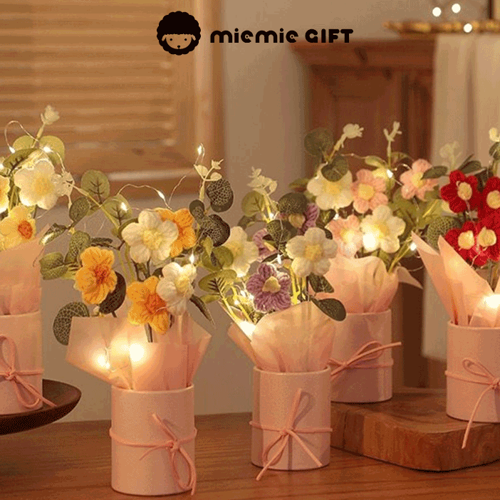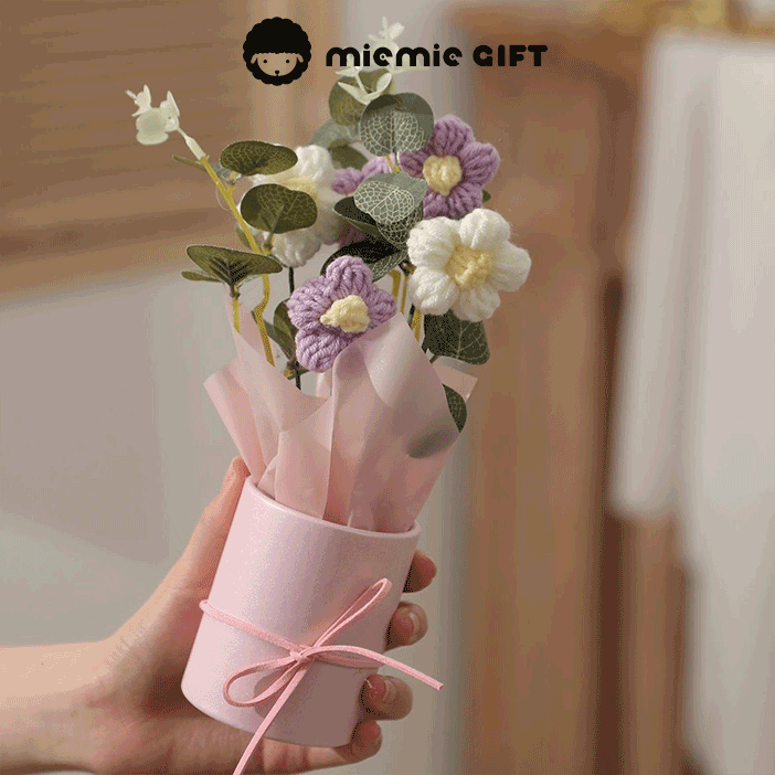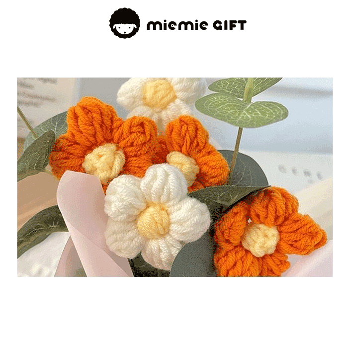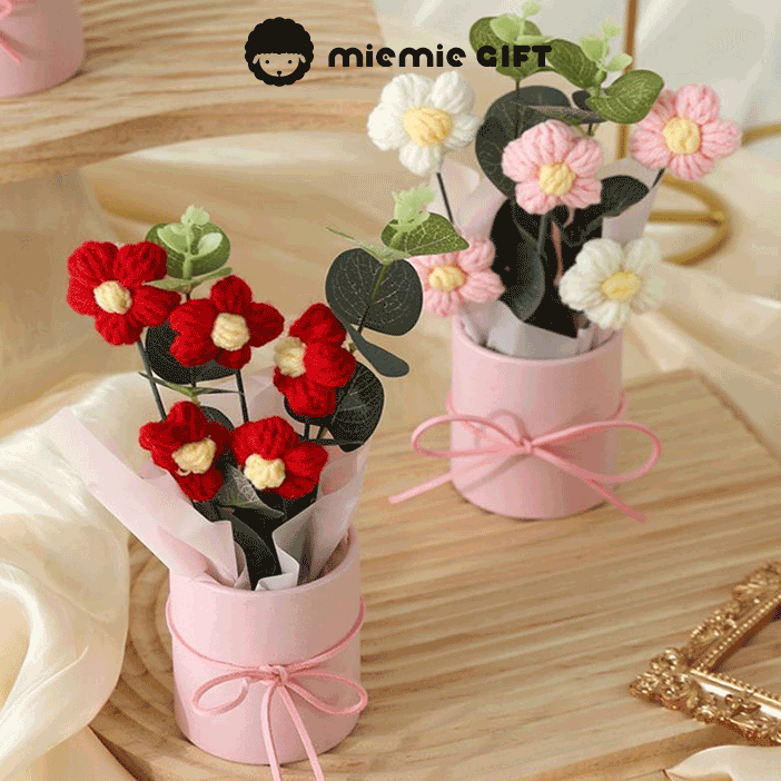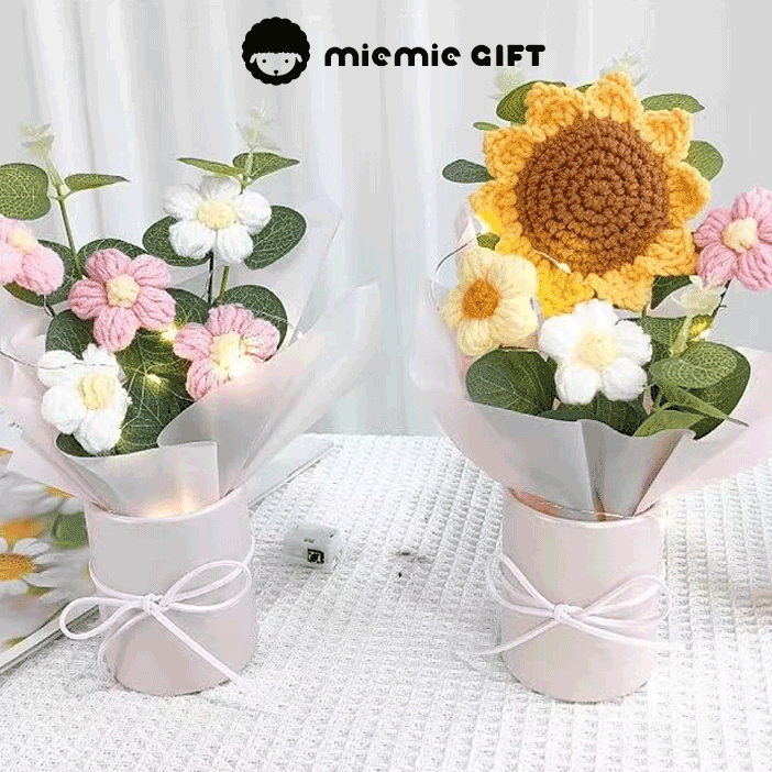 Cada flor está tejida a mano, lo que hace que cada ramo sea único y lleno de personalidad.